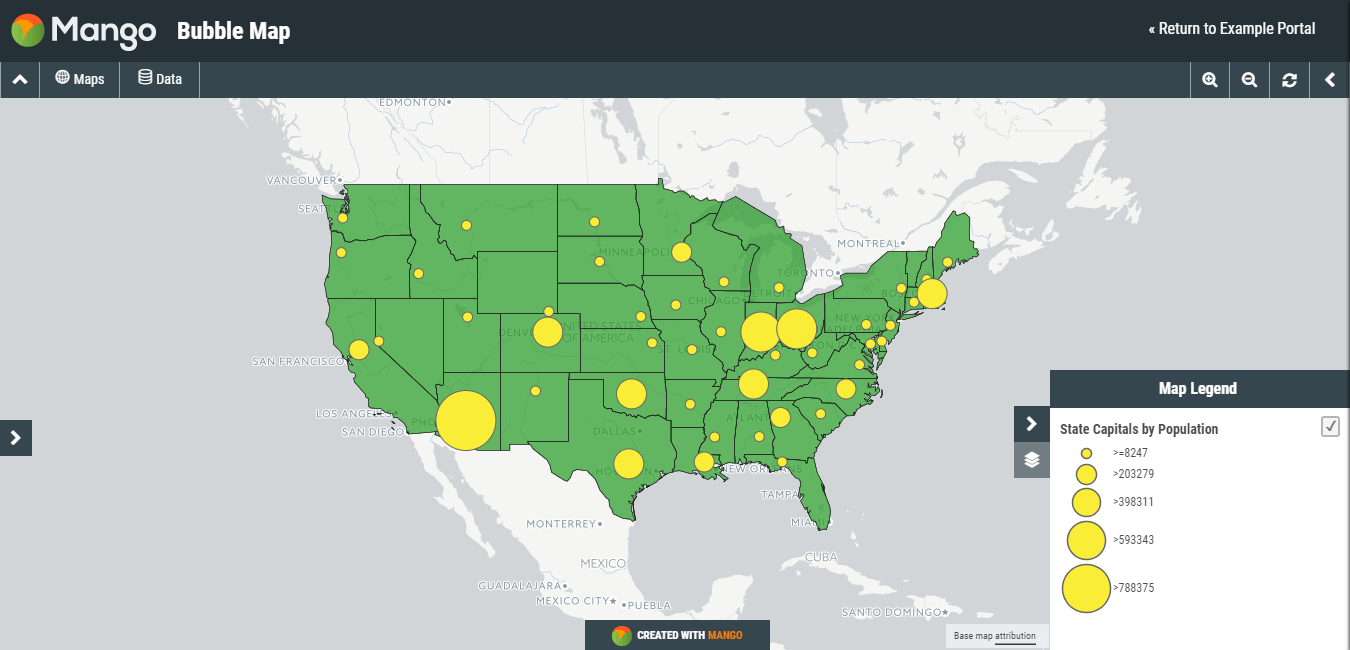Point, Line, and Polygon data can be reframed as proportional representations of the numerical data, represented as circles of varying size determined by the selected value. It’s common to use two layers when visualizing bubble maps from polygon data - the lower layer visualized with basic or category styling to represent the geographic area, and the bubble on the upper layer to illustrate the proportional data.