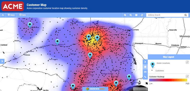 A heat map visualization of customers overlaid with a series of points that indicate our dealership locations can instantly show us the dealerships that are in very close proximity to our customers, and those areas where our dealerships might have a large, but very geographically sparse customer base.