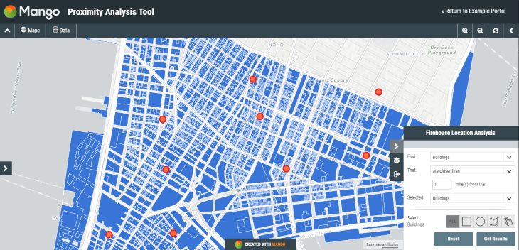Additionally, to really put the power of the map in the hands of users, we can allow them to also select features manually using a circle or point-and-click and then run a query or proximity analysis on those features.