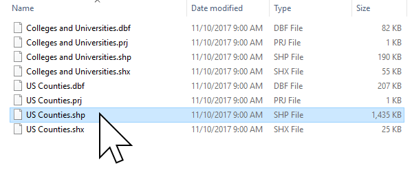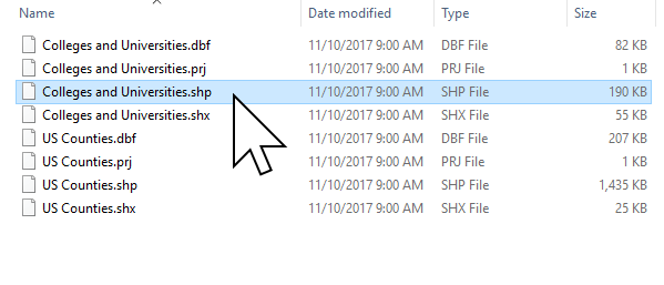 First unzip the sample data you downloaded and save it in a local directory. You will see there are two Shapefiles: Colleges and Universities, and US Counties.