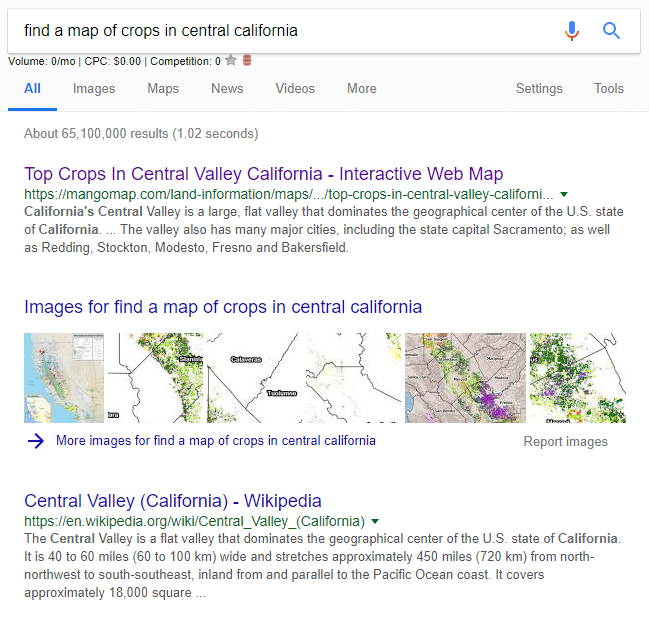 For example, the query “Find a map of crops in Central California” has a very clear intention to find a map that shows crops in central California. The more specific the query, the more relevant the results will be.
