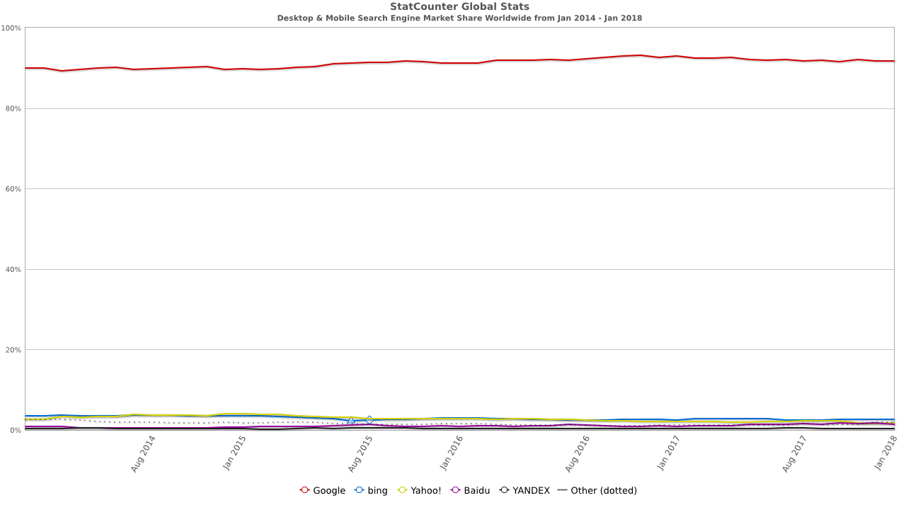 With a staggering 91.74% market share of search requests globally, Google is more than just head and shoulders above the competition - they’re literally up in the exosphere alongside Zeus, Yoda, and Kind Of Blue era Miles Davis, and unless you please the Google gods you will never be given pride of place in the SERPs (Search Engine Result Pages).