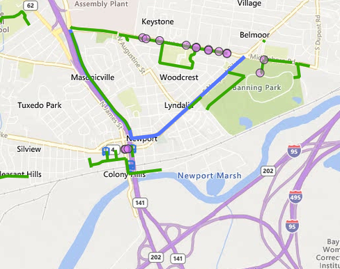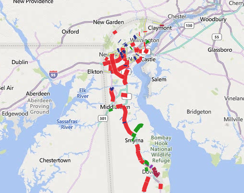 The map below show the MAP-21 generated regional travel time reliability for trucks along the interstate system with data used the National performance measures. Reporting is divided into five periods: morning peak (6-10 a.m.), midday (10 a.m.-4 p.m.) and afternoon peak (4-8 p.m.) Mondays through Fridays; weekends (6 a.m.-8 p.m.); and overnights for all days (8 p.m.-6 a.m.).